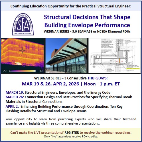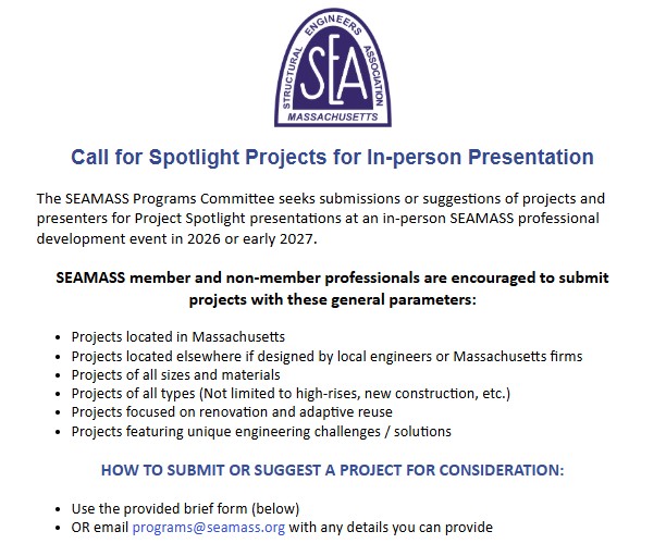 SEAMASS members who are licensed structural engineers are encouraged to consider joining the SEAMASS Board of Directors for the next fiscal year. Also, any member is invited to sit in as a guest at an upcoming SEAMASS Board meeting. Meetings are typically held on the 3rd Wednesday of each month. Please contact SEAMASS Secretary Ellen Swanson, PE to indicate that you would like to attend, and to confirm the meeting time.