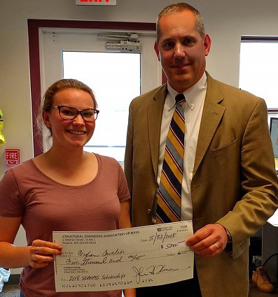 Pictured: Civil engineering student Meghan Cavalier accepts a $5,000 award check from SEAMASS Vice President Bill Lovallo, PE.