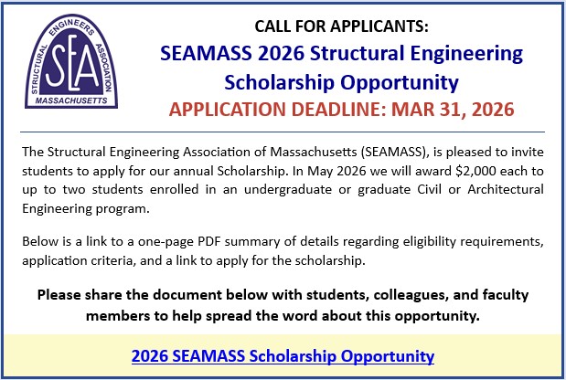 SEAMASS members who are licensed structural engineers are encouraged to consider joining the SEAMASS Board of Directors for the next fiscal year. Also, any member is invited to sit in as a guest at an upcoming SEAMASS Board meeting. Meetings are typically held on the 3rd Wednesday of each month. Please contact SEAMASS Secretary Ellen Swanson, PE to indicate that you would like to attend, and to confirm the meeting time.