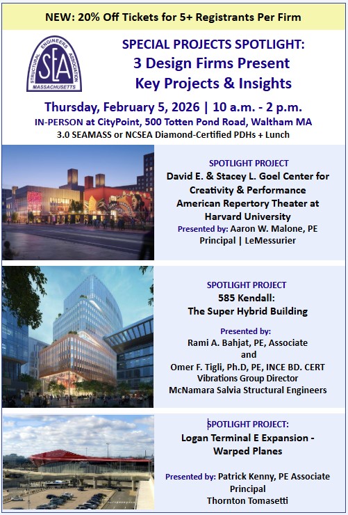 The Boston Association of Structural Engineers (BASE) hosts dinner meetings with guest presenters bi-monthly from 5:30–9 p.m. BASE President Justin Kordas, PE invites SEAMASS members to attend one meeting for free (a $100 value that covers the costs of meal, drinks, and presentation).