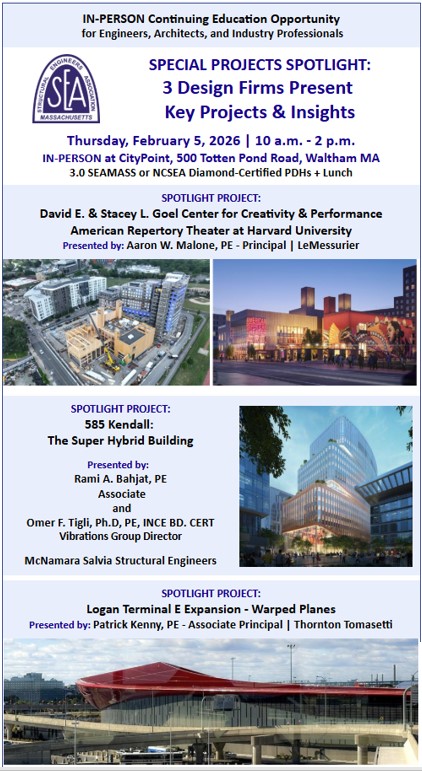 The Boston Association of Structural Engineers (BASE) hosts dinner meetings with guest presenters bi-monthly from 5:30–9 p.m. BASE President Justin Kordas, PE invites SEAMASS members to attend one meeting for free (a $100 value that covers the costs of meal, drinks, and presentation).